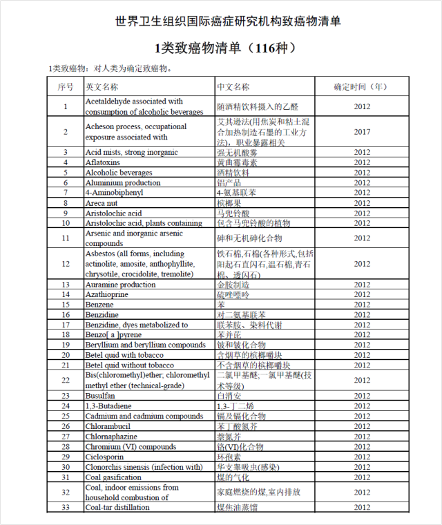 ? ? ? 國際癌癥研究機構(gòu)自1971年以來就對900多個致癌因素進行評估,其中有400多個被確定為對人類致癌或者可能致癌。這些致癌因素又分為4個等級,即一類致癌、二類可能致癌、三類未知和四類可能不致癌四個級別。其中,一類致癌物包含116種,詳細清單如下: